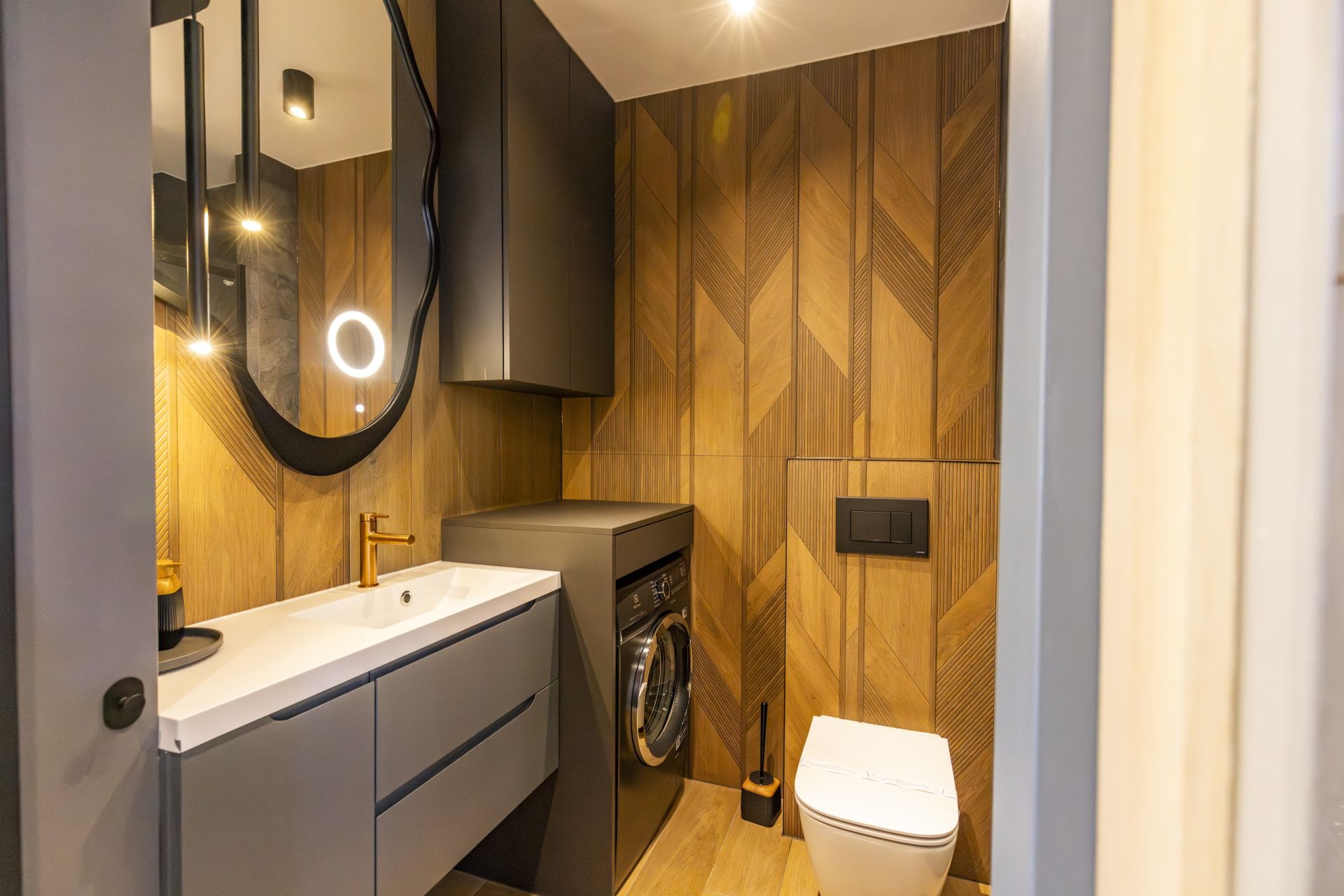 - Elegancka łazienka została wzbogacona o saunę, tworząc domową strefę SPA. To idealne miejsce na regenerację ciała i umysłu po dniu pełnym wrażeń — chwila ciepła i relaksu, która dopełnia komfort całego apartamentu.