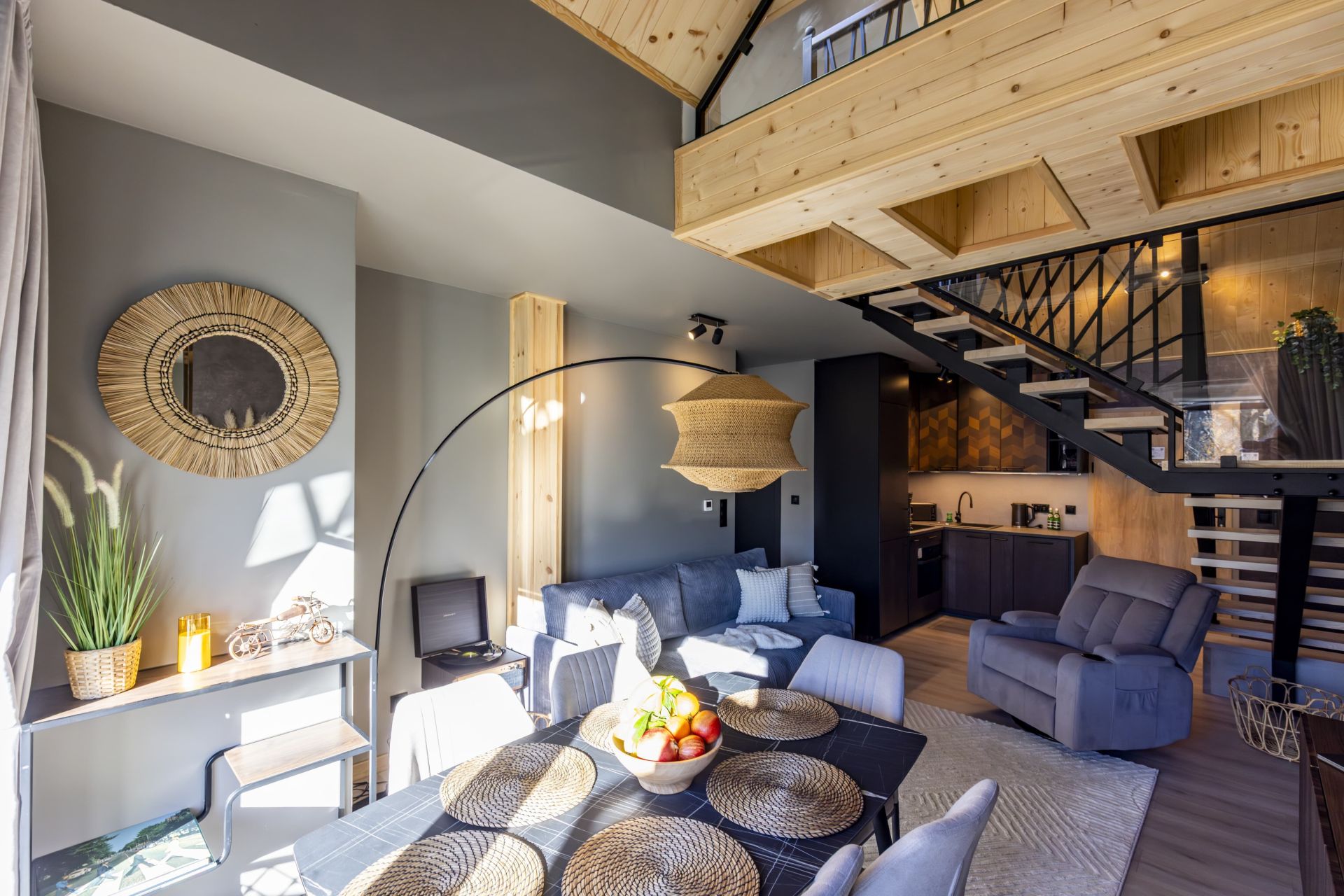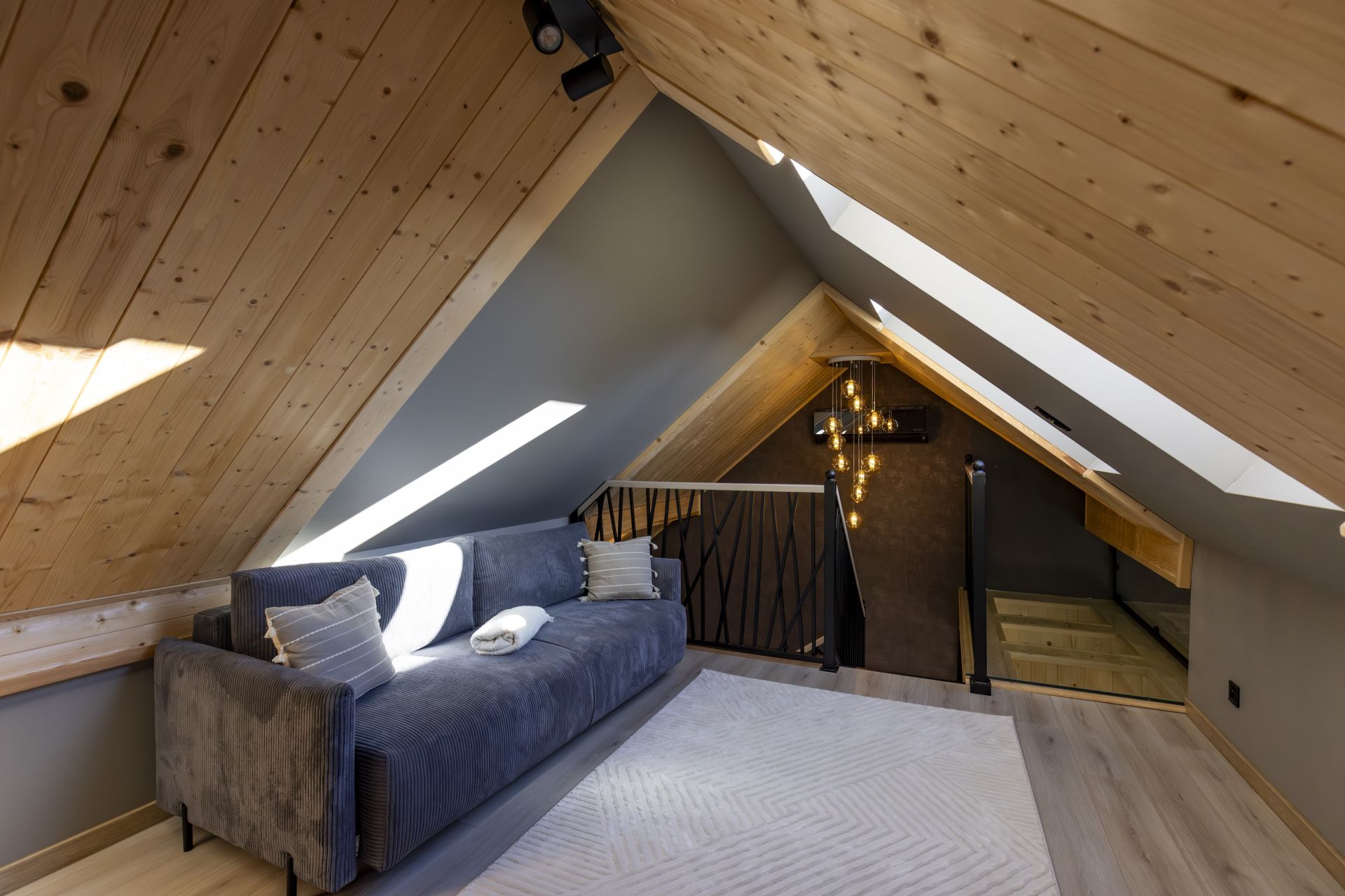 - Sypialnia 2 na antresoli oferuje dodatkową, kameralną strefę wypoczynku z rozkładaną kanapą. To doskonałe miejsce zarówno do snu, jak i chwili prywatności, które zachwyca swoim niepowtarzalnym klimatem i funkcjonalnością.