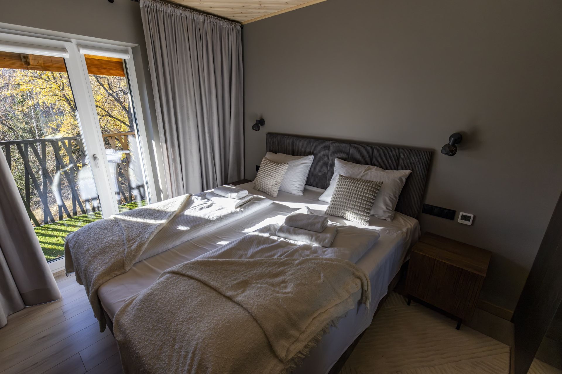 - Sypialnia 1 z podwójnym łóżkiem to prawdziwa strefa regeneracji. Miękkie tekstylia, stonowana kolorystyka i subtelne oświetlenie tworzą harmonijną przestrzeń idealną do wypoczynku i spokojnego snu.