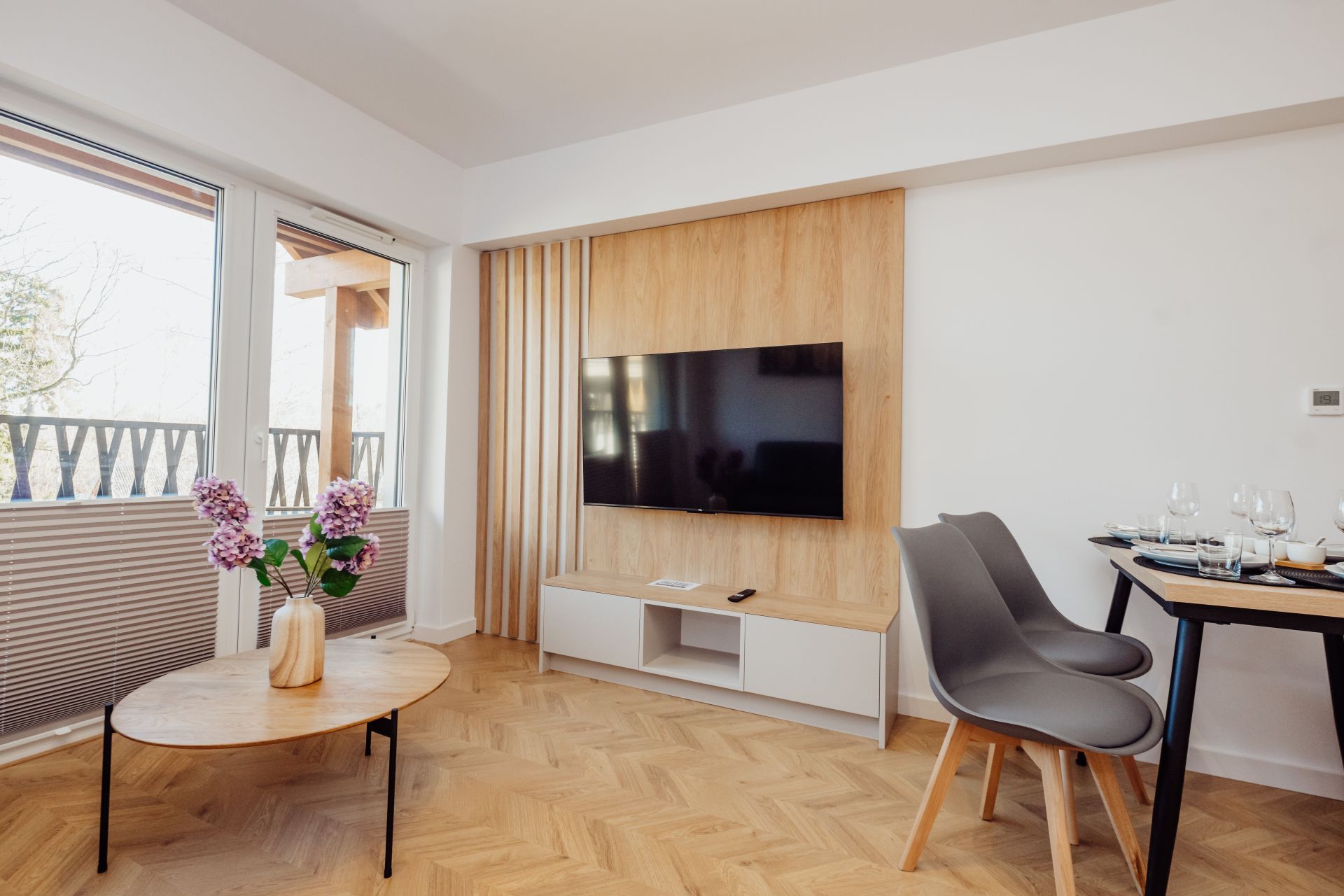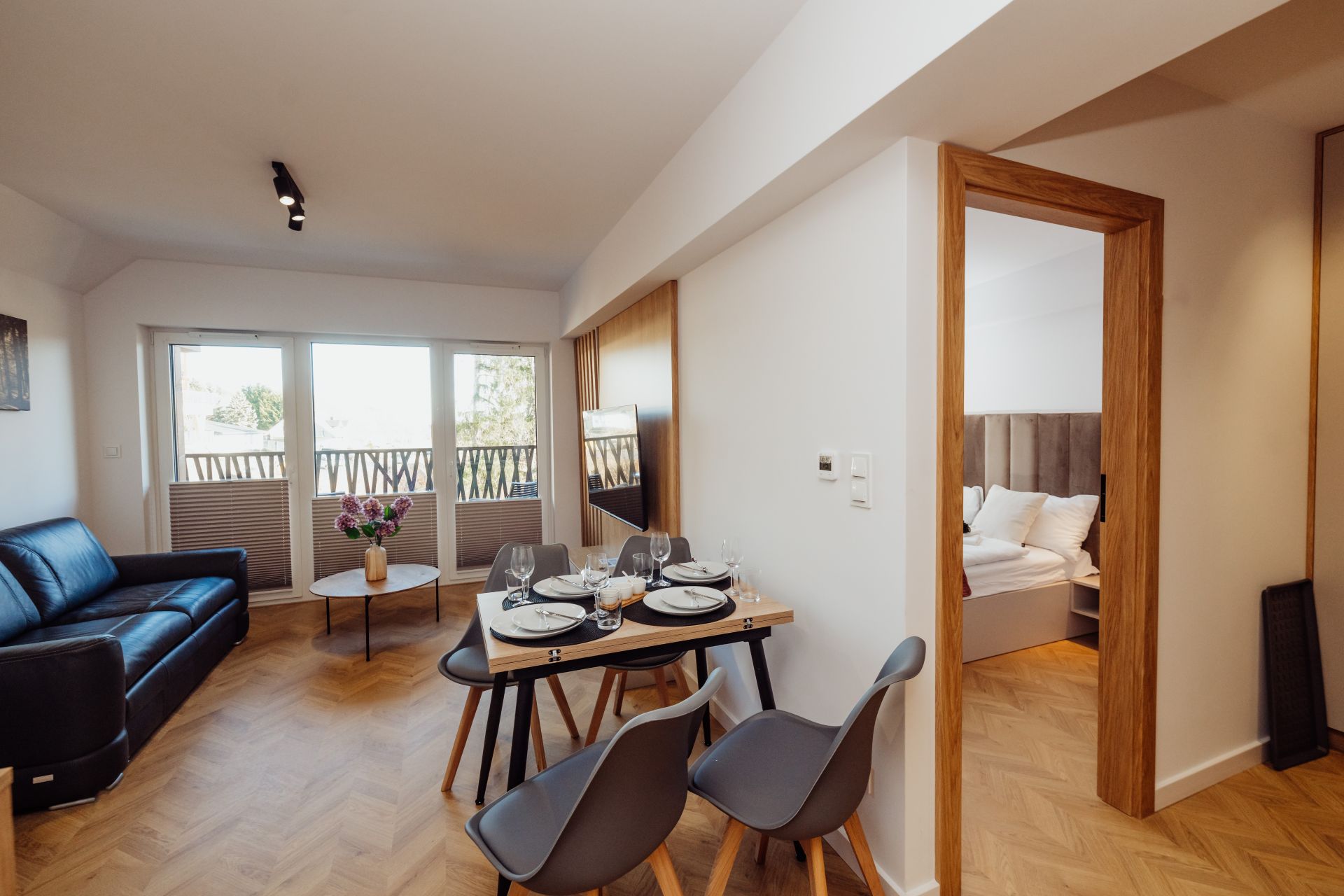 - Balkon – prywatna przestrzeń z widokiem na zieleń, wyposażona w meble ogrodowe – idealna na poranną kawę lub wieczorne wino.