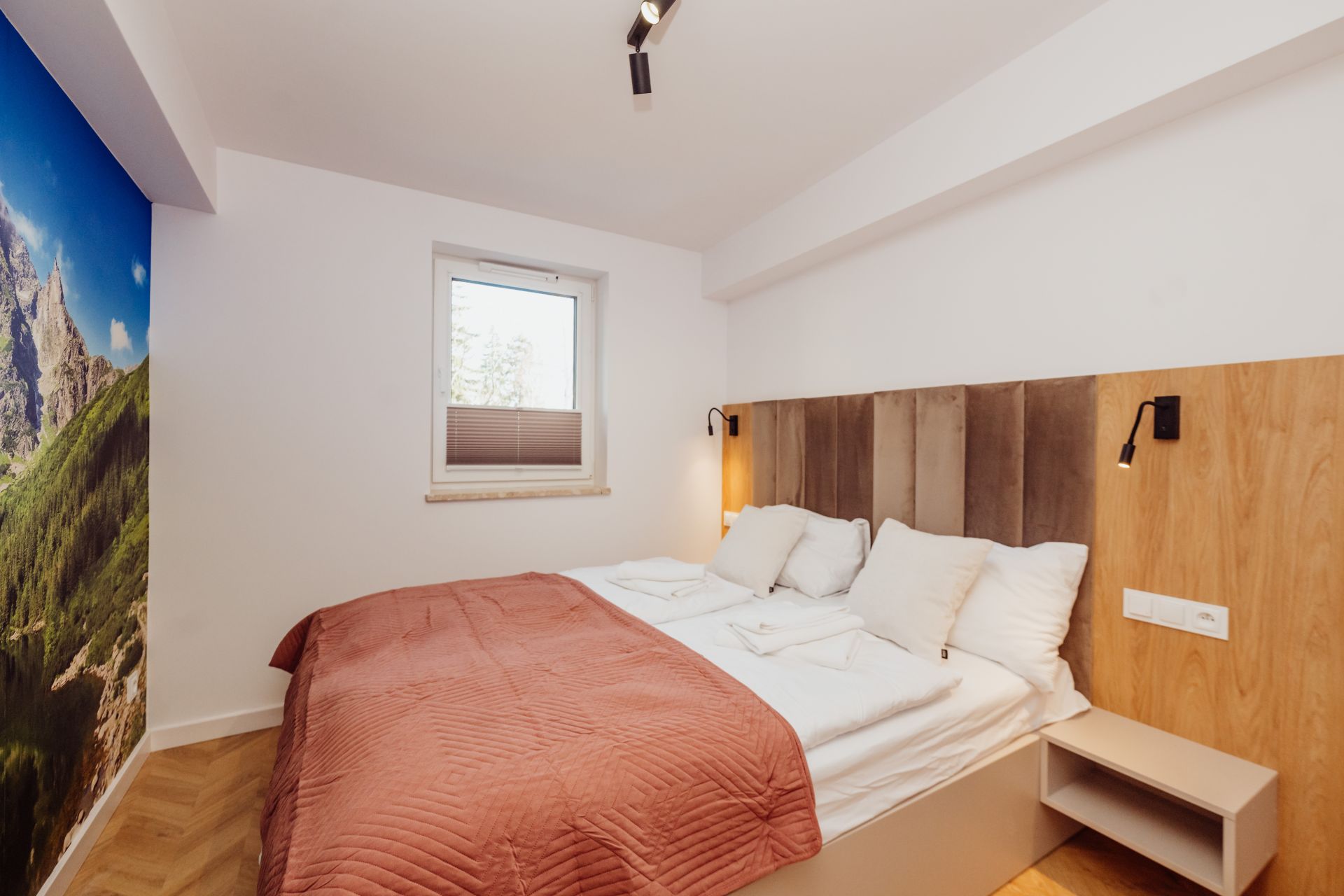 - Sypialnia – przytulna, z wygodnym łóżkiem małżeńskim, szafkami nocnymi i nastrojowym oświetleniem.