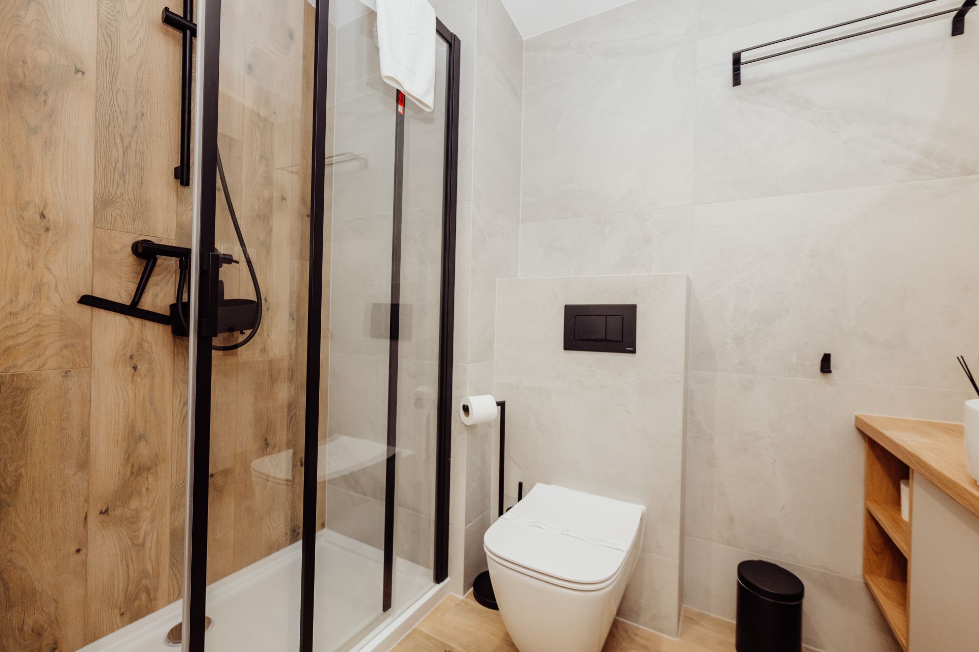 - Łazienka – nowoczesna, z prysznicem typu walk-in, świeżymi ręcznikami i elegancką armaturą.