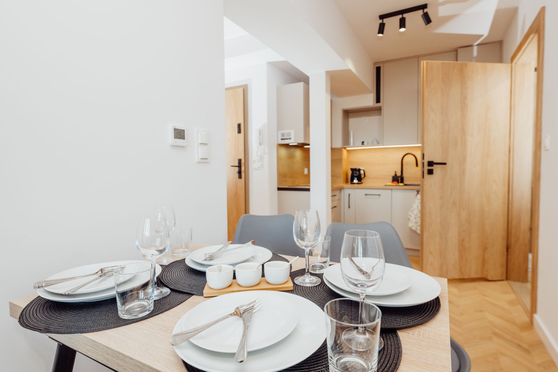 - Salon z aneksem kuchennym – przestronny, jasny pokój z wygodną sofą, stołem jadalnianym oraz w pełni wyposażonym aneksem kuchennym (lodówka, zmywarka, płyta indukcyjna, czajnik).