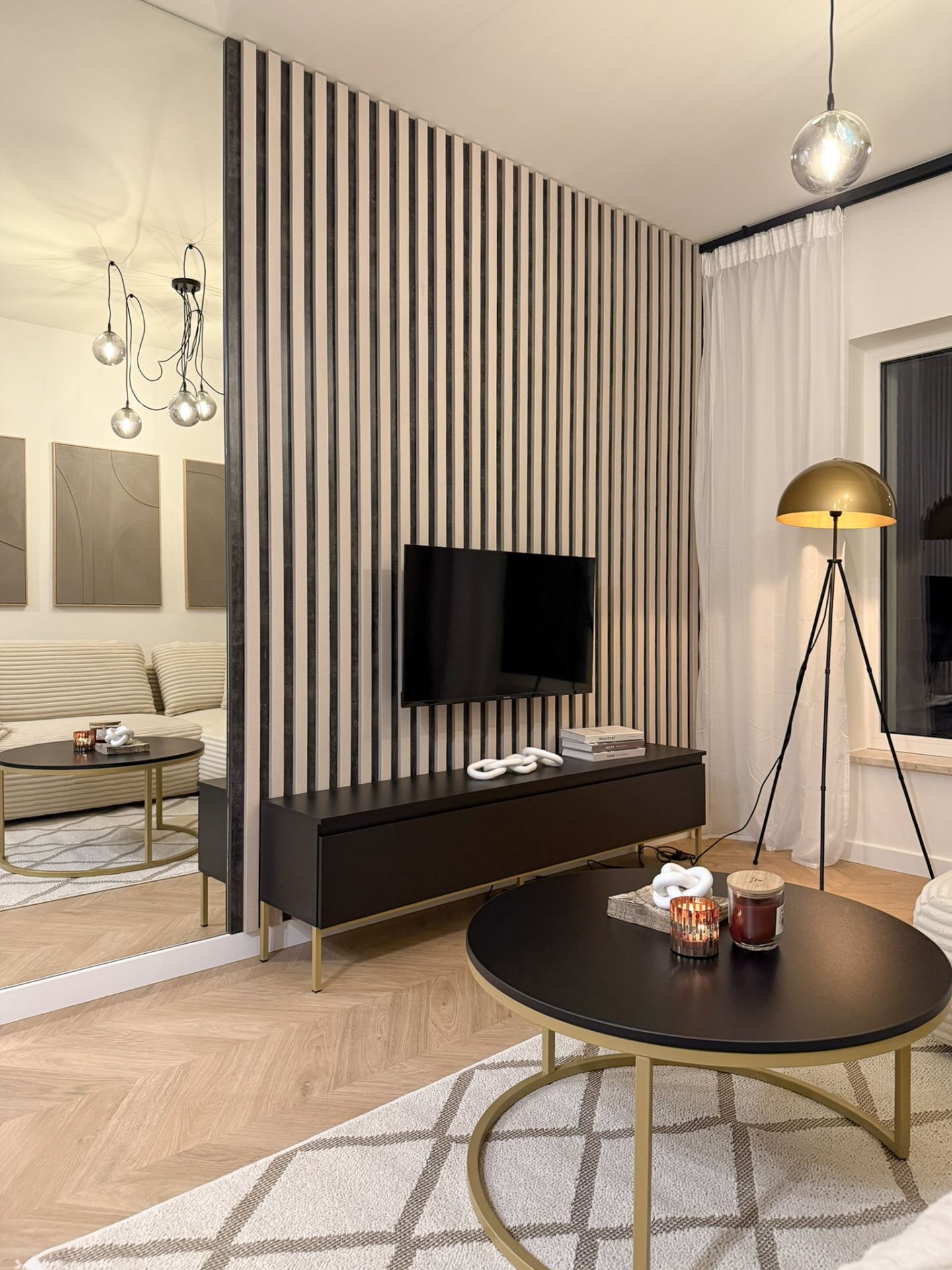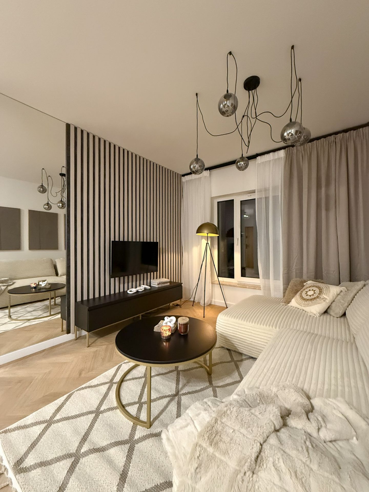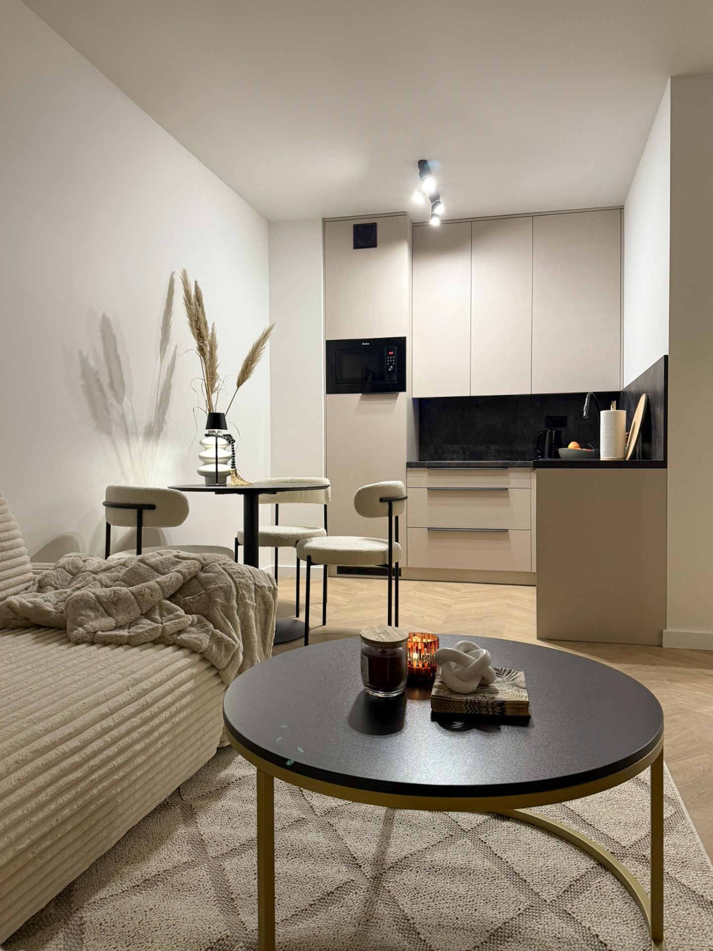 - Salon z aneksem kuchennym – styl i przestrzeń - Przestronny salon zachwyca elegancją i ciepłem. Kremowa sofa z weluru, złoty stolik kawowy i dekoracje inspirowane naturą tworzą idealne miejsce do relaksu lub pracy zdalnej.
