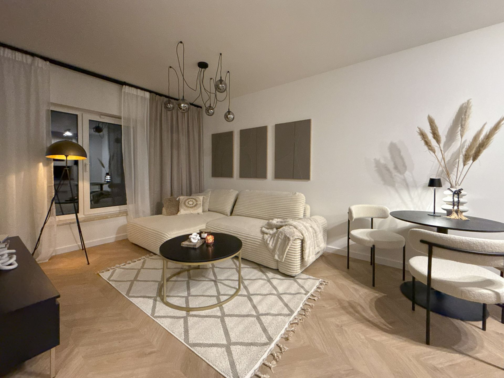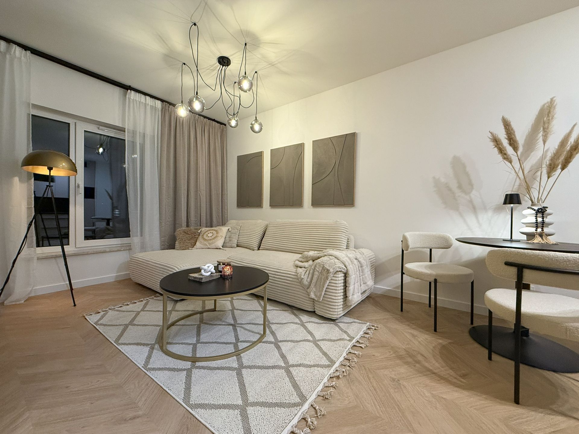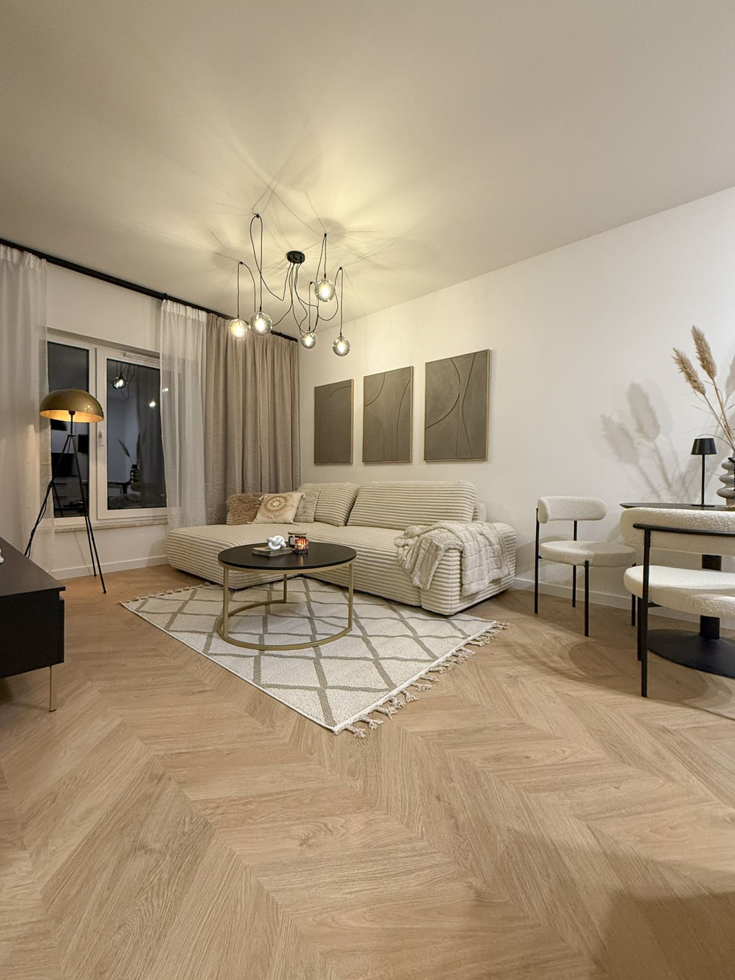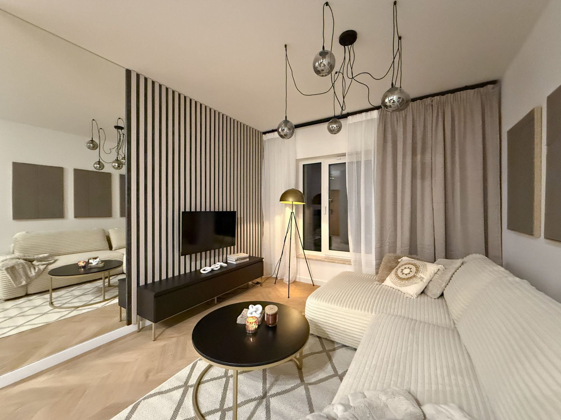 - Salon z aneksem kuchennym – styl i przestrzeń - Przestronny salon zachwyca elegancją i ciepłem. Kremowa sofa z weluru, złoty stolik kawowy i dekoracje inspirowane naturą tworzą idealne miejsce do relaksu lub pracy zdalnej.