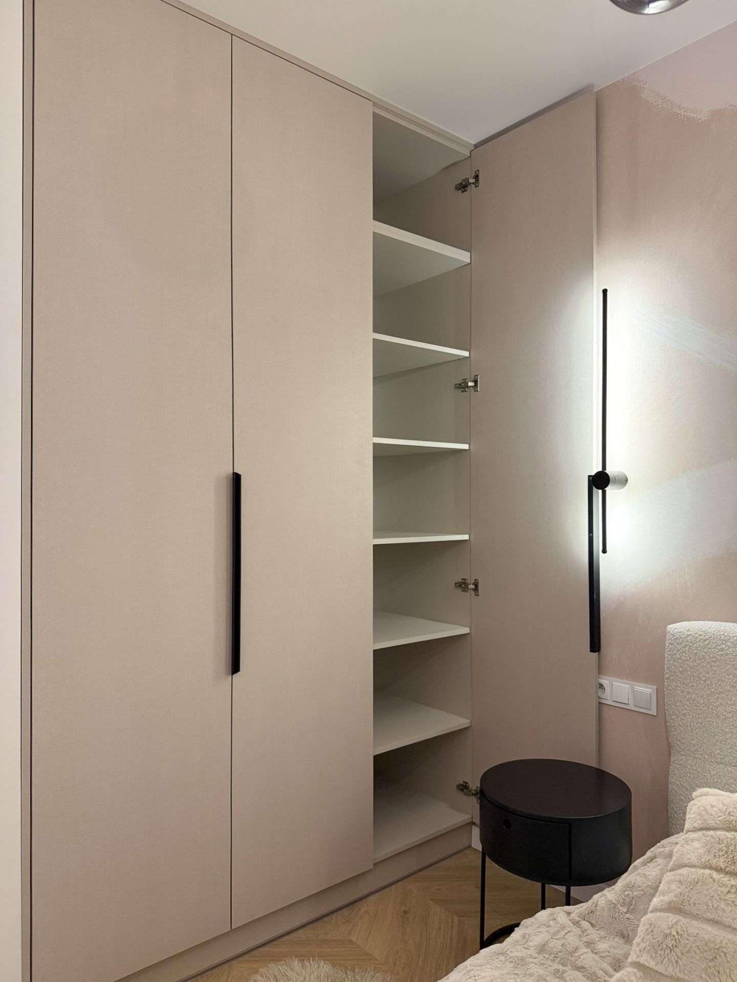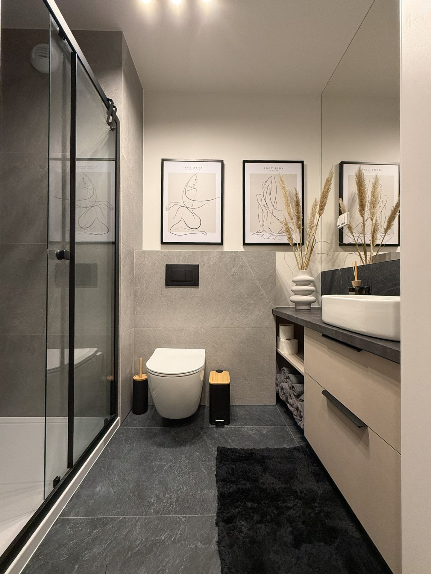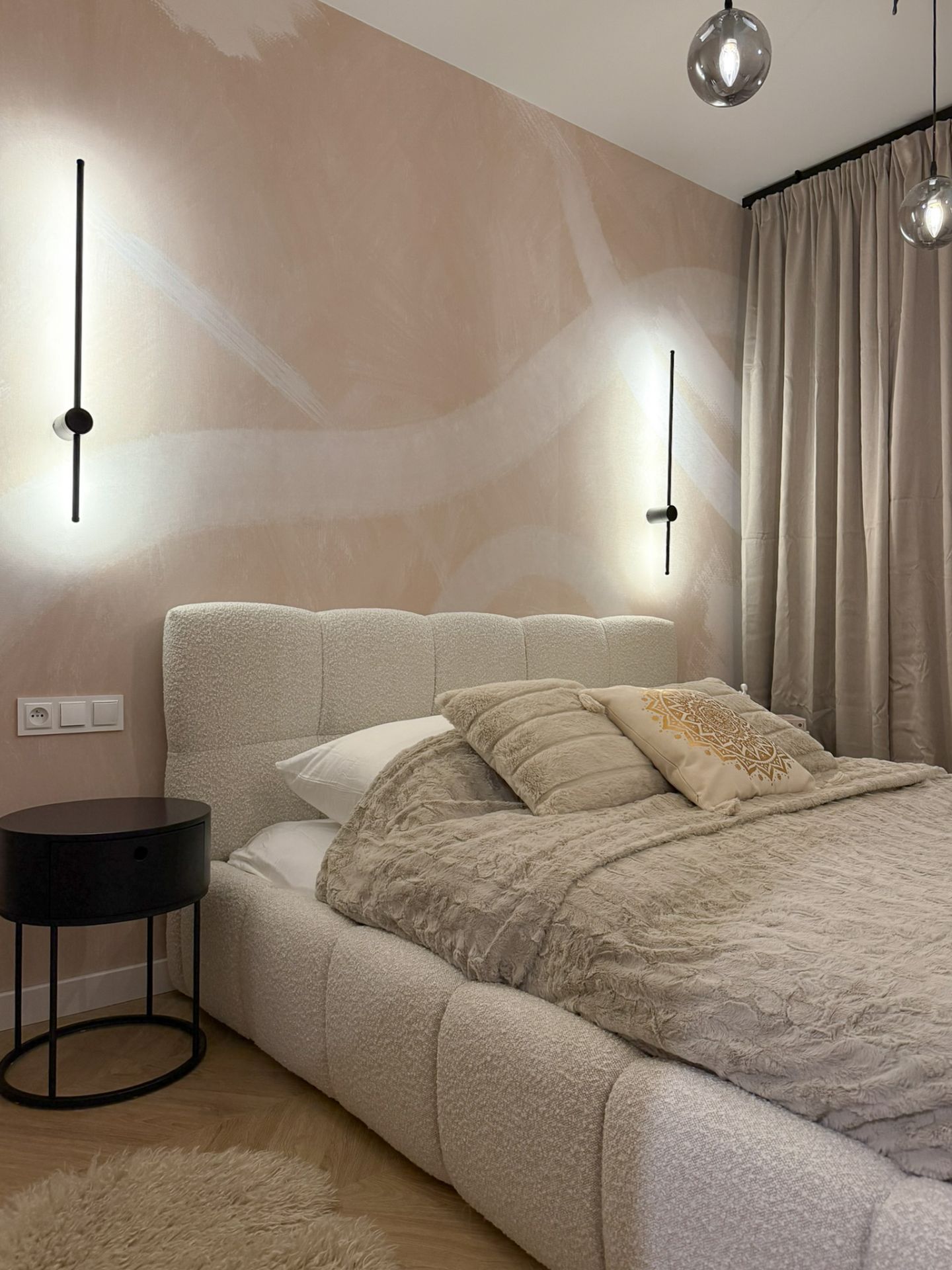 - Sypialnia – sanktuarium snu i relaksu - Ukojenie po dniu pełnym wrażeń znajdziesz w sypialni z pikowanym łóżkiem i zagłówkiem z tkaniny bouclé. Subtelne beże, faliste wzory na ścianach i miękkie pościele tworzą przytulną atmosferę. Delikatne światło lamp i kremowe zasłony wprowadzają spokój, a okno z widokiem pozwala rozpocząć dzień w rytmie natury.