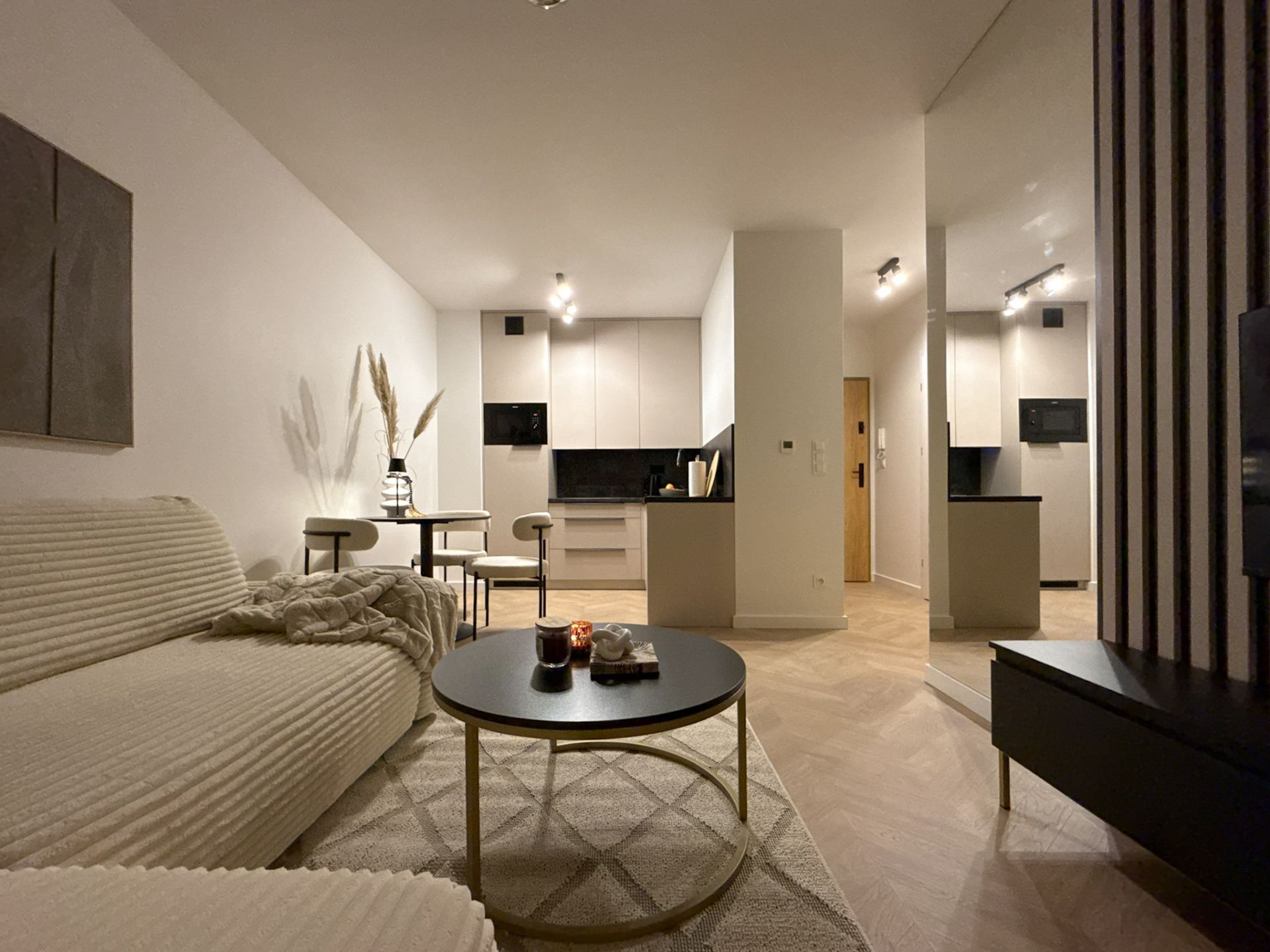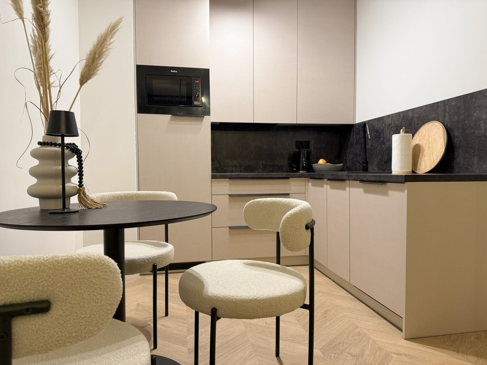 Nowoczesny aneks kuchenny, utrzymany w beżowo-drewnianej tonacji, został w pełni wyposażony – w płytę indukcyjną, piekarnik, lodówkę, zmywarkę, czajnik i komplet naczyń. Okrągły stół z miękkimi krzesłami sprzyja wspólnym posiłkom w domowej atmosferze.