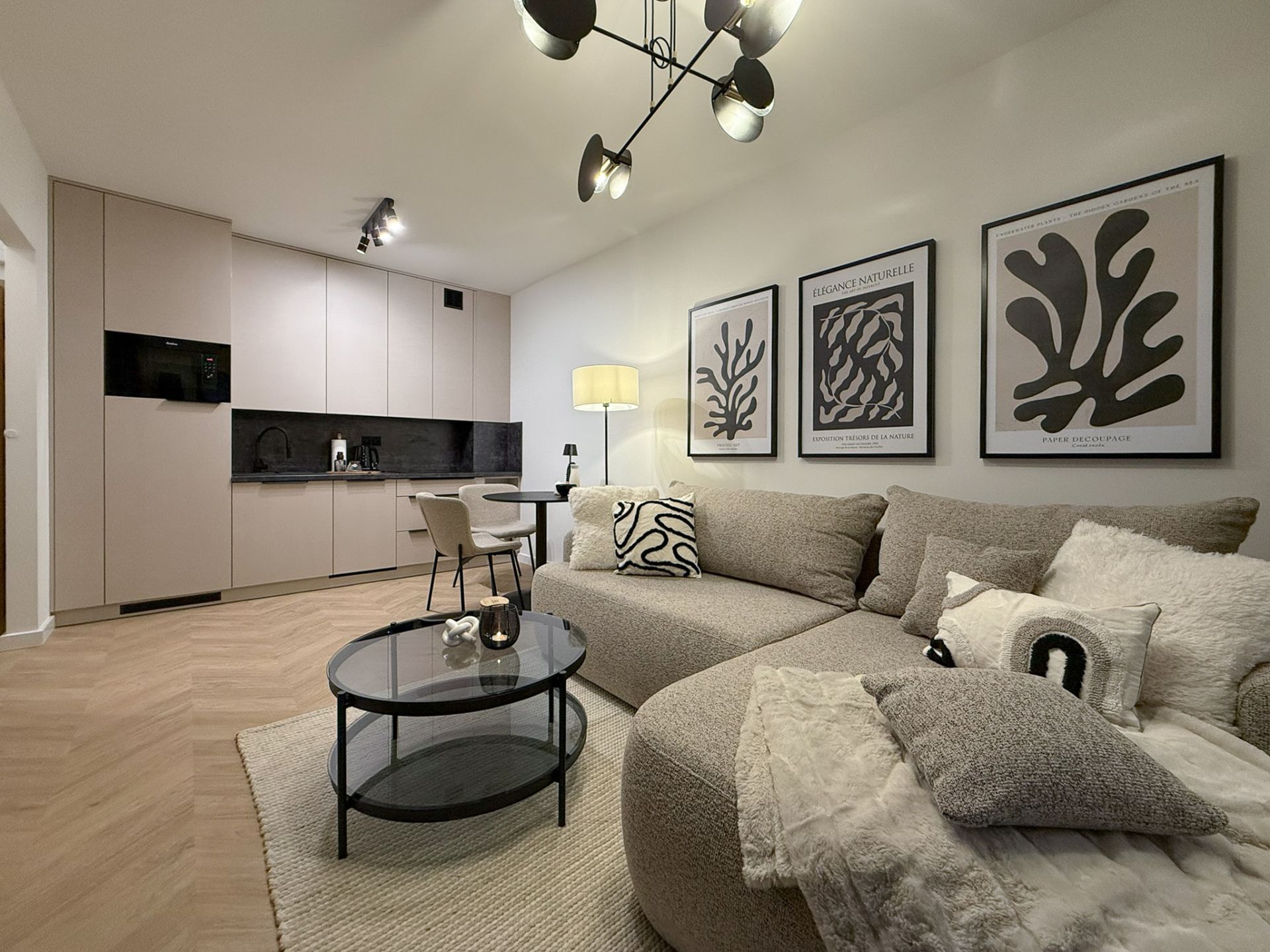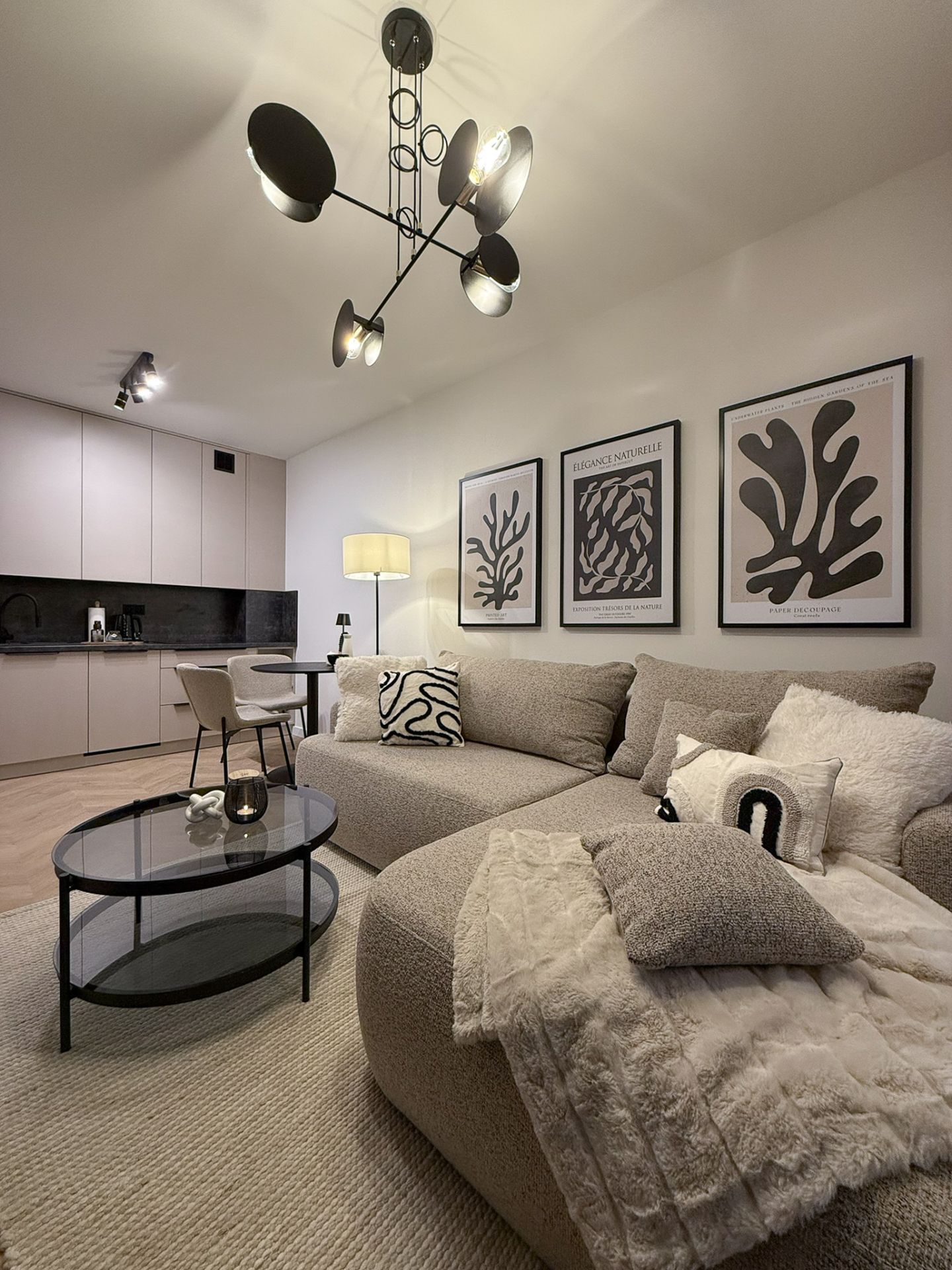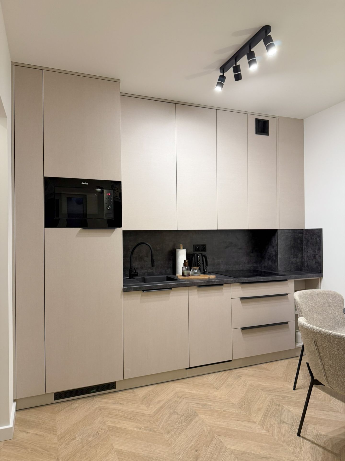 - Nowoczesny aneks kuchenny utrzymany jest w tonacji beżu i grafitu. Matowe fronty, czarne uchwyty i ciemny blat nadają mu eleganckiego charakteru. Kuchnia została w pełni wyposażona – w płytę indukcyjną, mikrofalówkę, lodówkę, czajnik oraz zestaw naczyń i akcesoriów. Owalny stół z pluszowymi krzesłami sprzyja wspólnym posiłkom i rozmowom w kameralnej atmosferze.