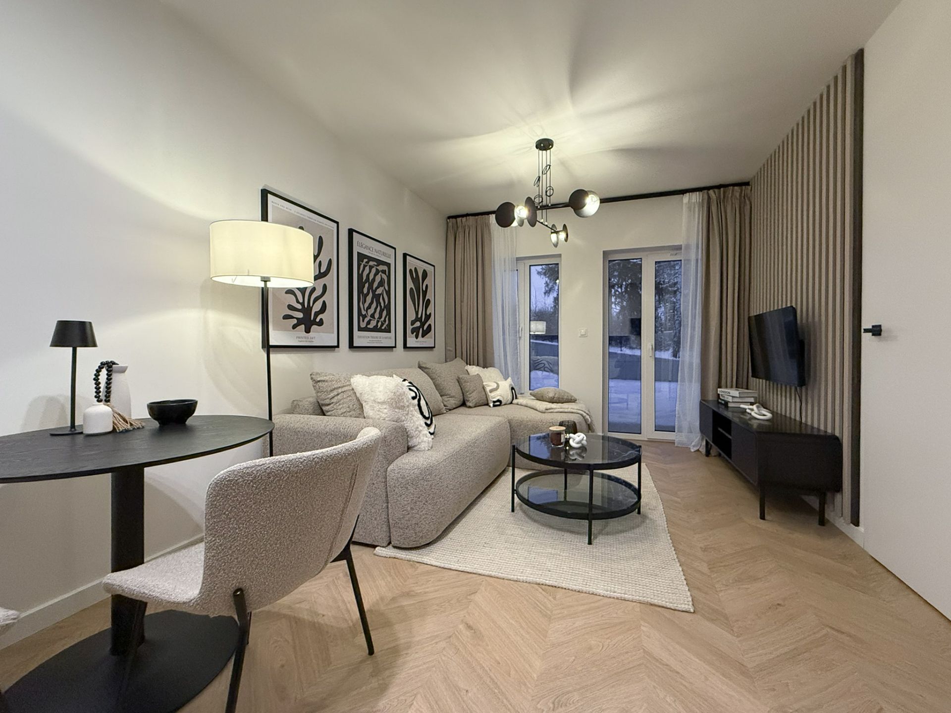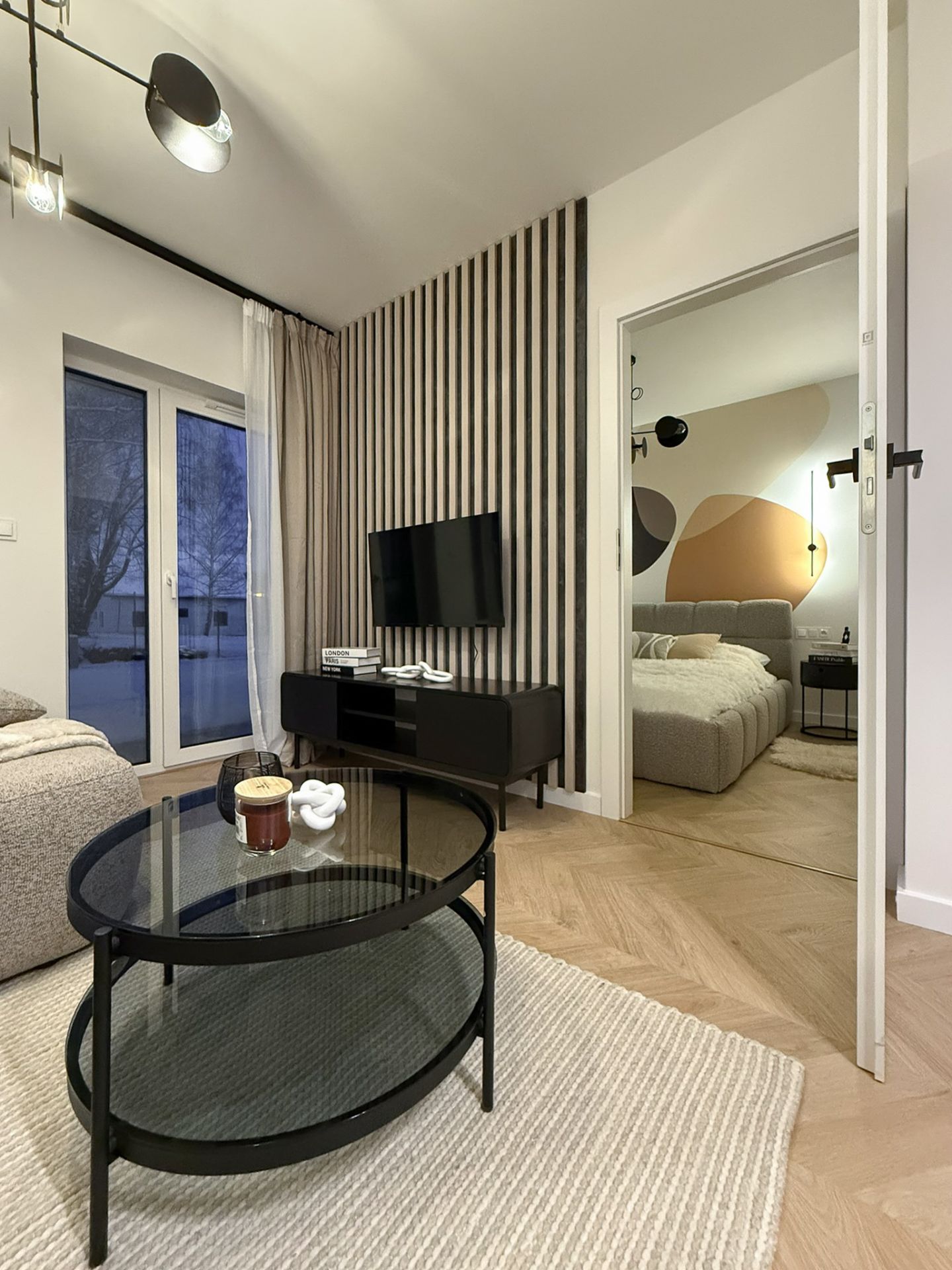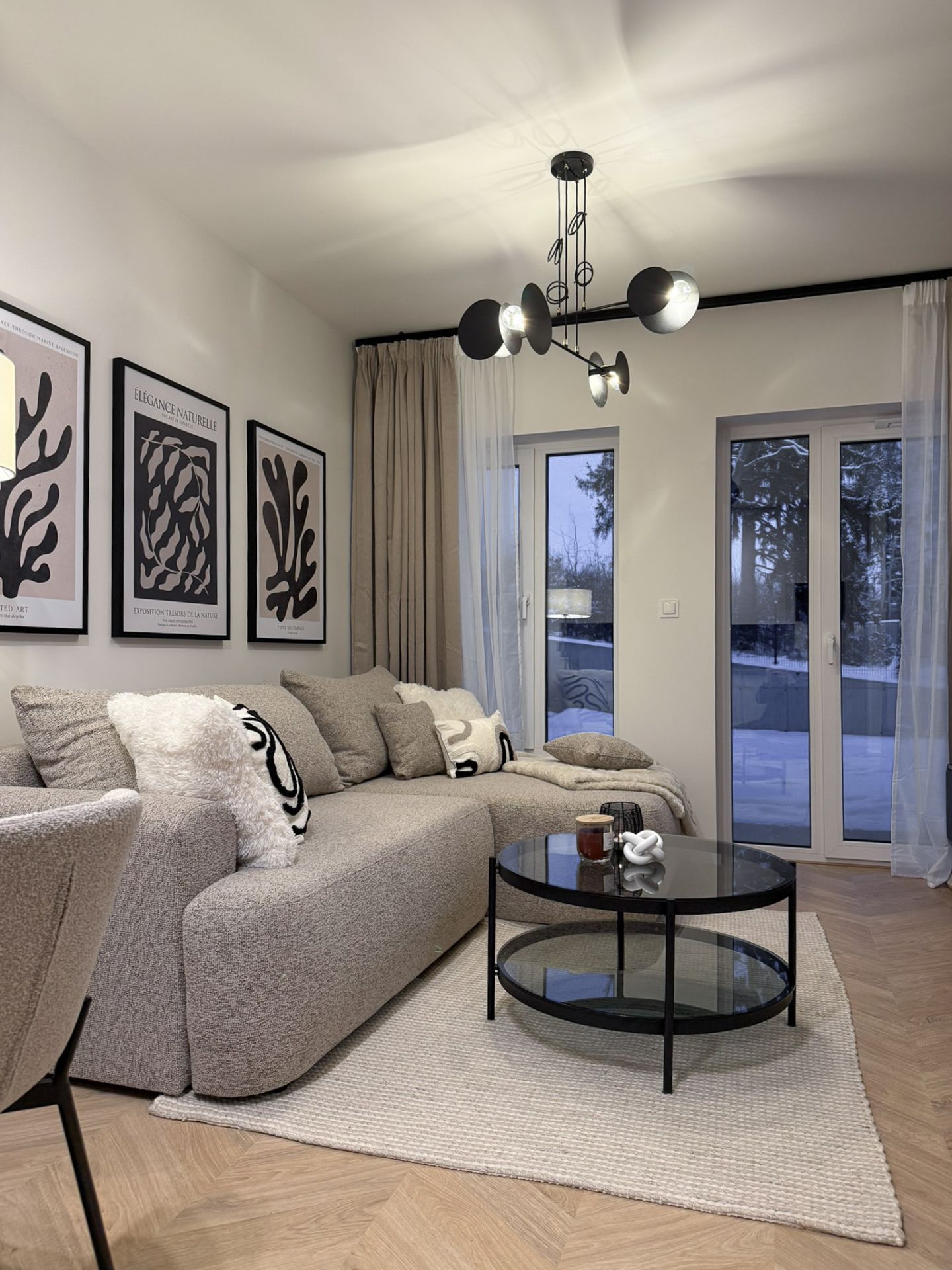 - Salon – przestrzeń pełna harmonii - to miejsce, w którym nowoczesność spotyka się z przytulnością. Rozkładana sofa w szarym welurze, dekoracyjny stolik kawowy i subtelne oświetlenie tworzą - idealne warunki do odpoczynku po dniu w górach. Duże okna i wyjście na balkon wpuszczają światło i otwierają widok na zieleń oraz górskie szczyty. To przestrzeń, w której zrelaksujesz się z książką, obejrzysz film lub wypijesz poranną kawę z widokiem na naturę.