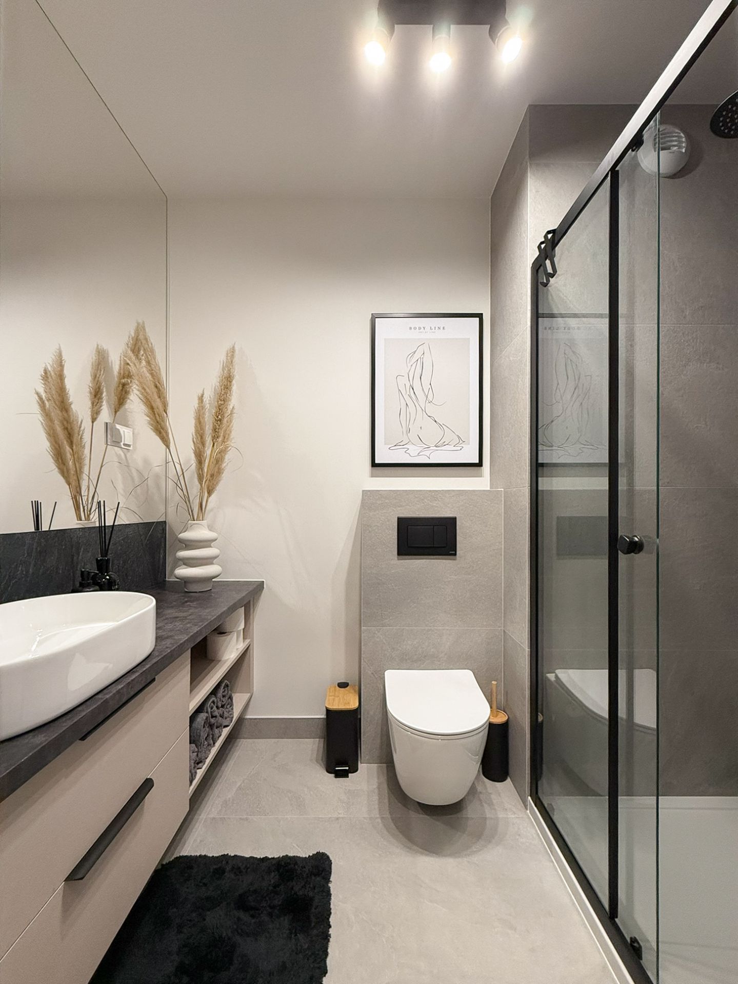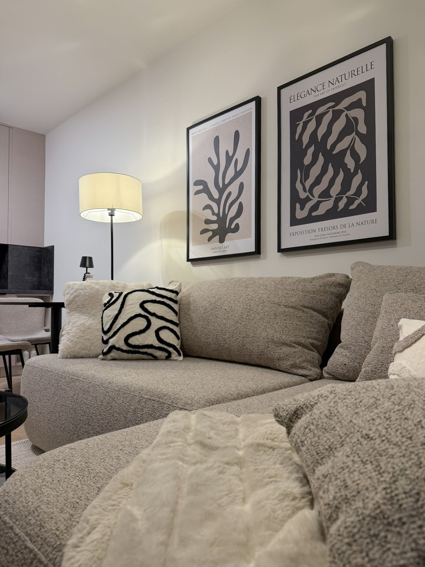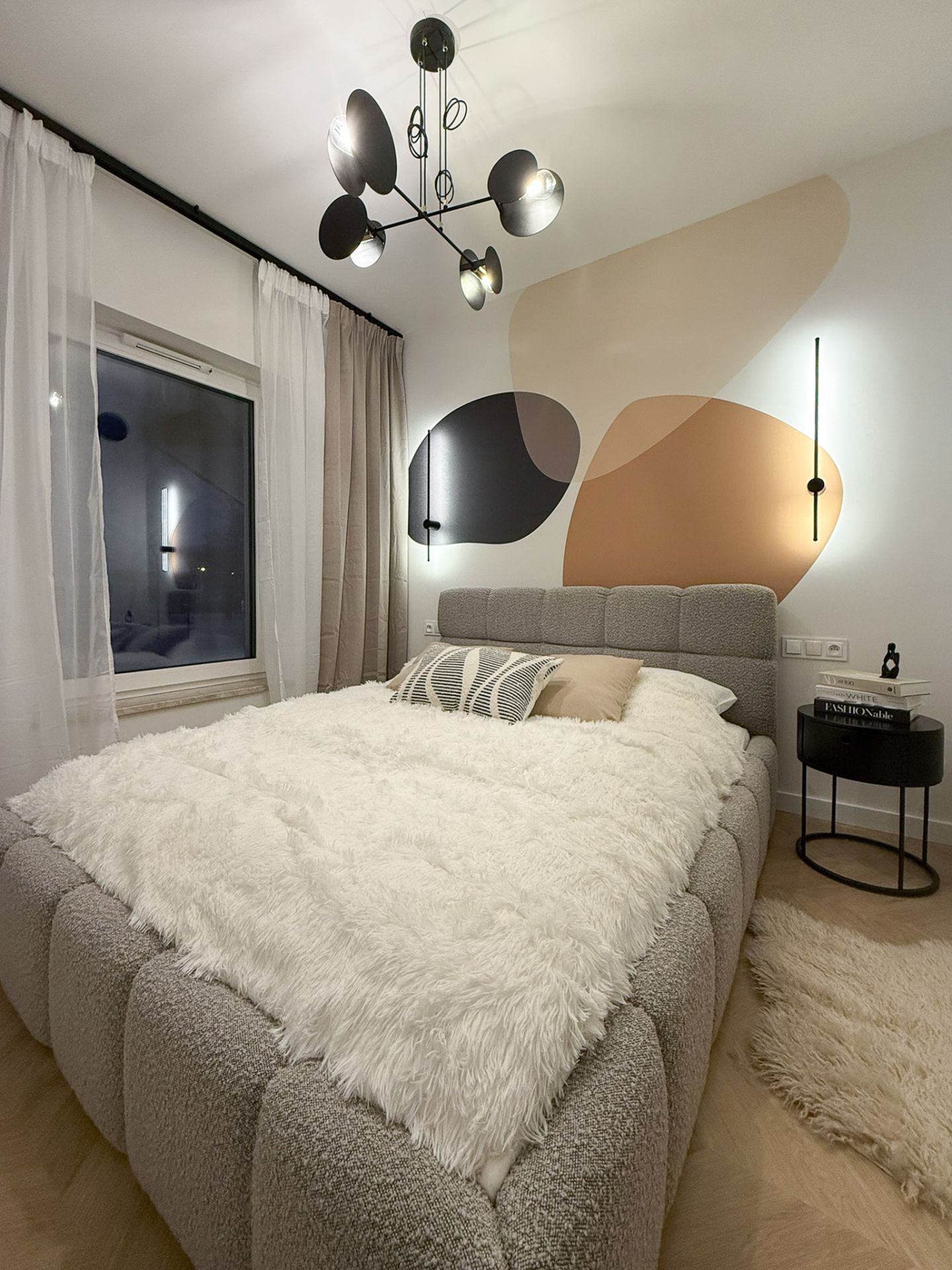 - Sypialnia – artystyczna oaza snu - to przestrzeń zaprojektowana z myślą o relaksie. Łóżko modułowe z zagłówkiem z tkaniny bouclé, miękkie pościele i delikatne oświetlenie tworzą atmosferę spokoju i komfortu. Abstrakcyjne wzory na ścianach, w odcieniach beżu i szarości, dodają wnętrzu artystycznego charakteru.
